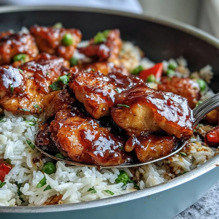 A splash of apple cider vinegar in the honey BBQ sauce cuts the sweetness and adds a bright tang that wakes up the whole dish. If you want heat, stir in a pinch of cayenne or a few dashes of hot sauce before you pour the glaze over the chicken. Brown rice works too, just add an extra half cup of broth and let it simmer for ten to fifteen minutes longer, checking occasionally to make sure it doesnt dry out.