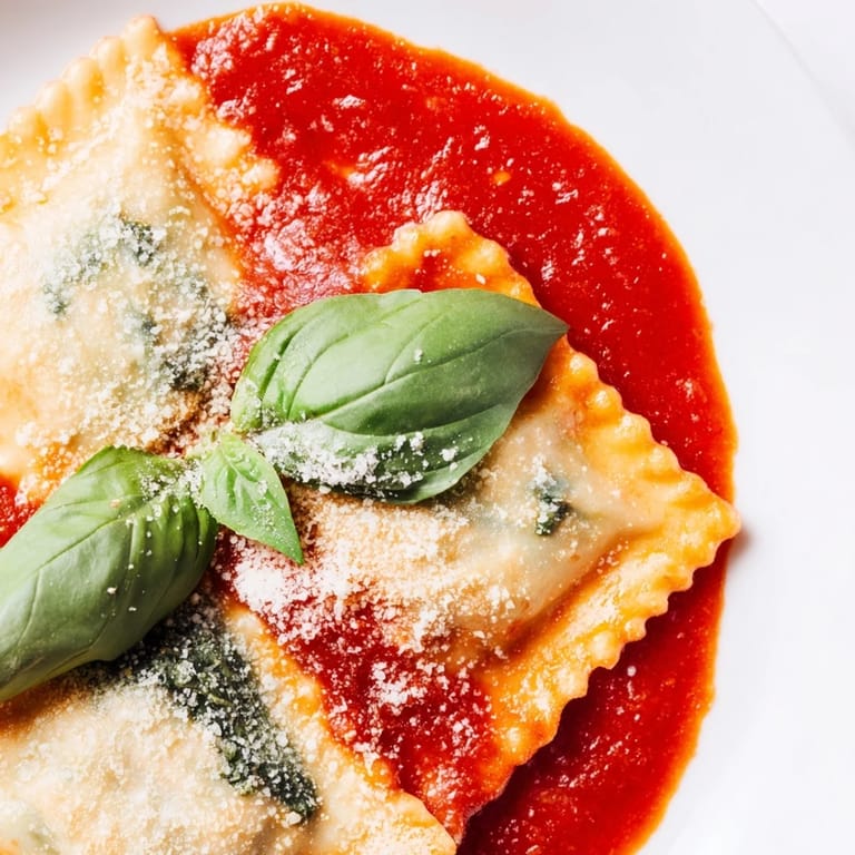 - Spoon sauce onto each plate, arrange the ravioli on top, then finish with more sauce, torn basil, and a generous shower of Parmesan. Serve it hot and watch faces light up.